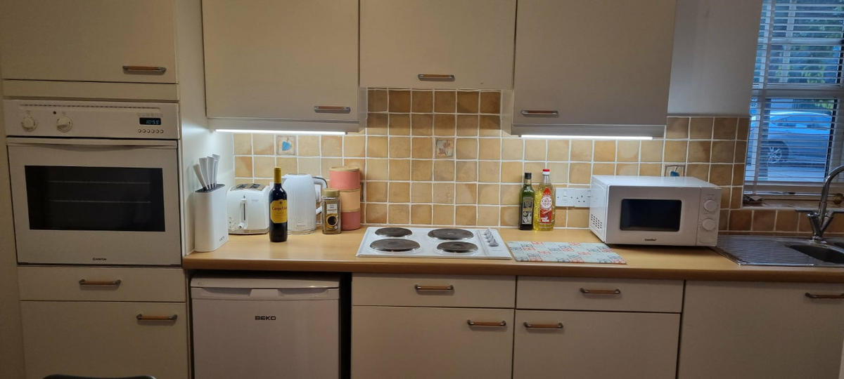 Kitchen with washing machine, oven, microwave, kettle etc. Clothes rails are available and launderette is nearby.