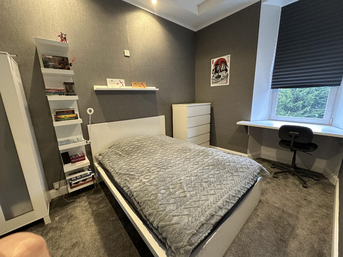 The 3 Bed Cumbernauld House has been renovated to a high standard with all mod cons for a comfortable stay. Stylish 3 bedroom house with one double bedroom and two single bedrooms, a fresh family bathroom, and a dedicated desk for working.