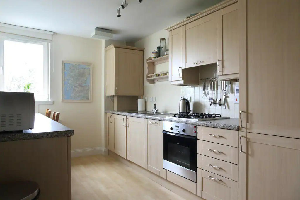 Fully fitted kitchen area with refrigerator, washing machine, dishwasher, electric kettle, Oven