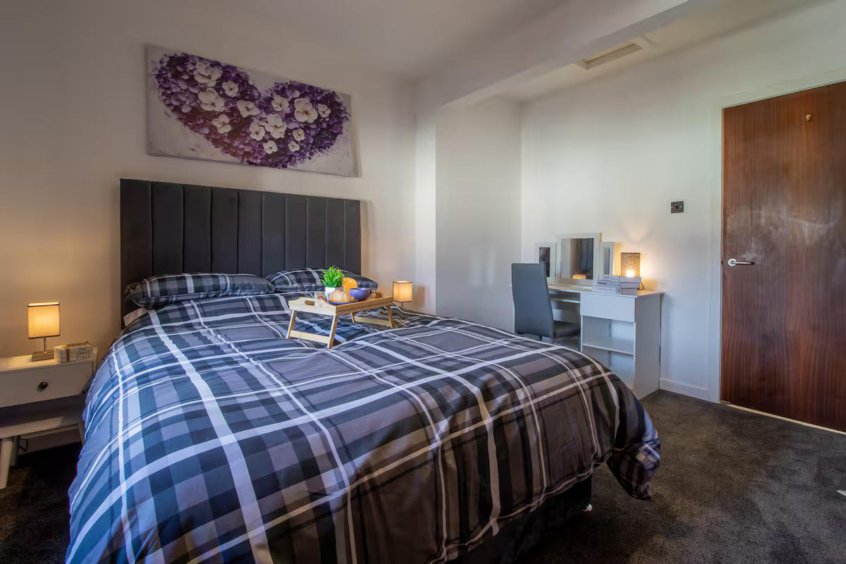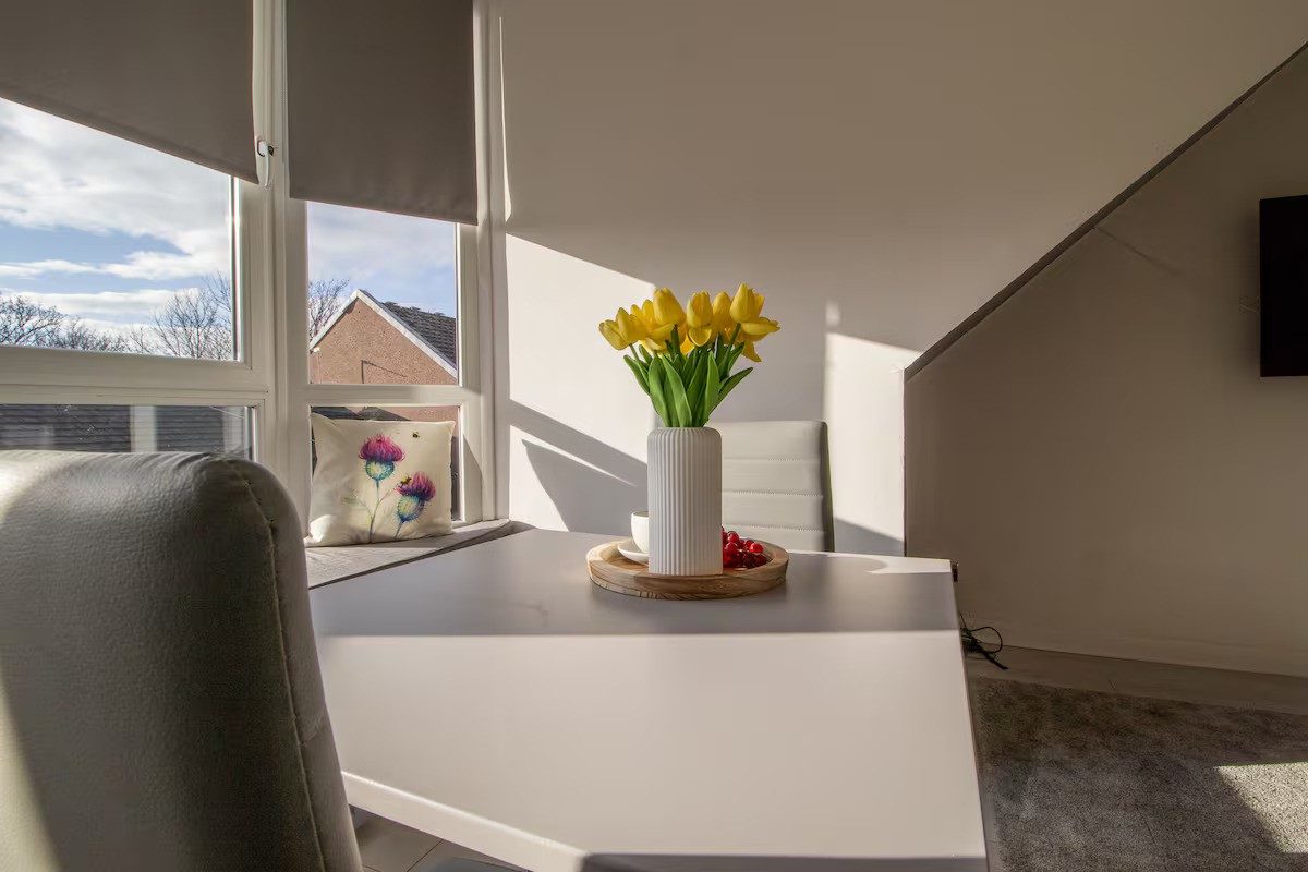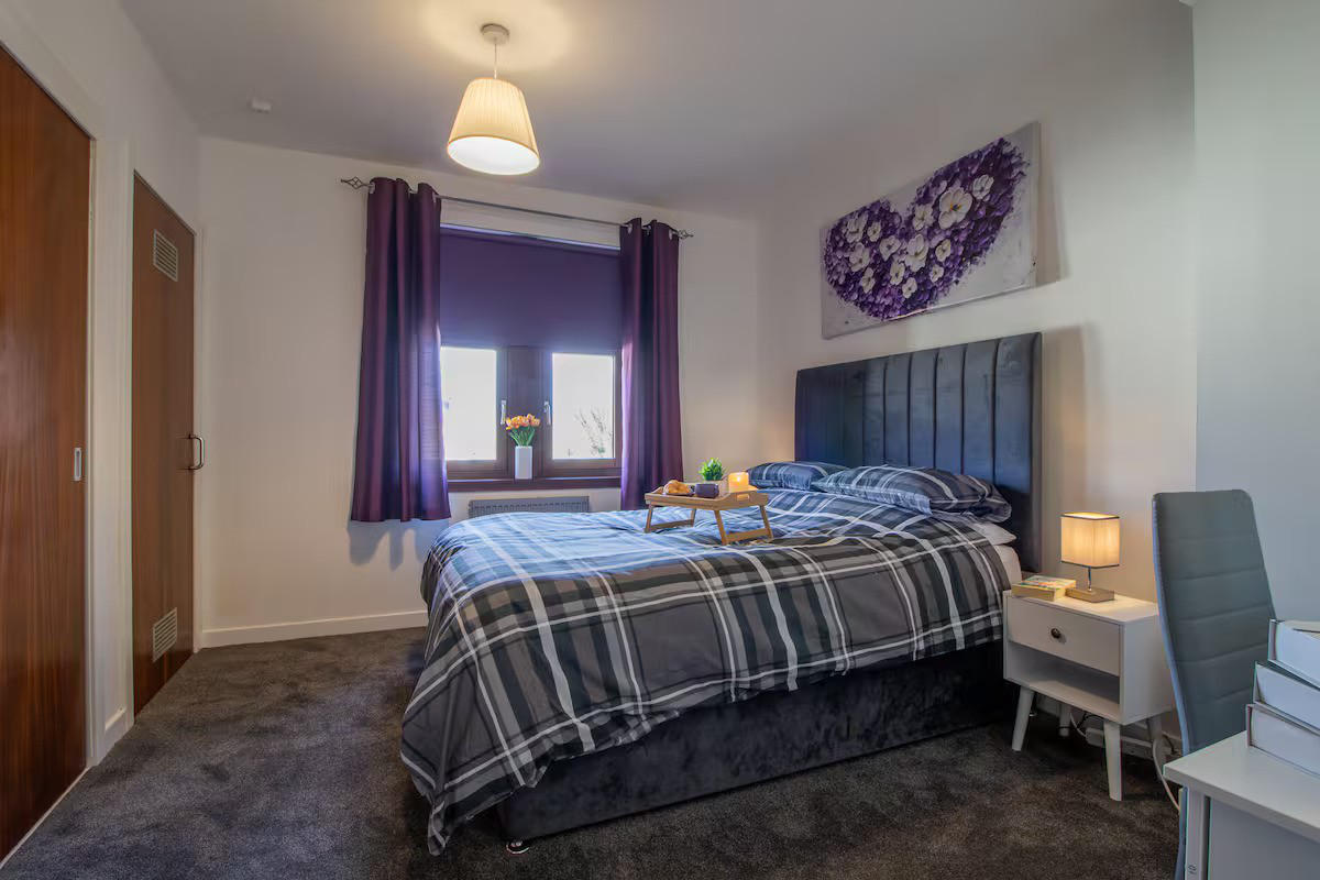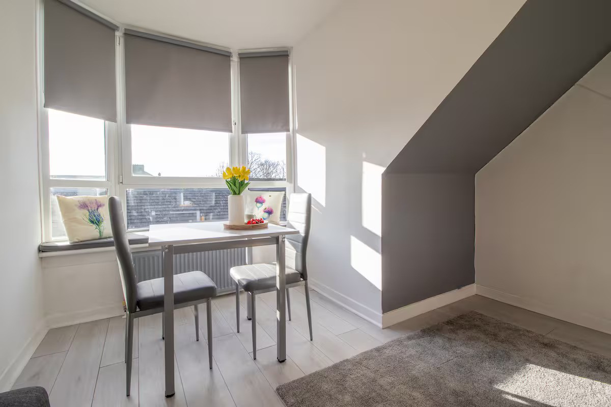 This stylish 1 bed apartment is located in the heart of Perth. As soon as you arrive, you'll be greeted by breath-taking views of the city skyline with the River Tay and North Inch just a moment away from your door.The living room is a modern space, complete with a smart TV, superfast broadband and dining table for two. The bright and airy atmosphere of the living room is sure to make you feel right at home and a lovely space to relax and unwind. We've left some of our favourite books on the shelves for you to enjoy reading whilst you're staying with us.