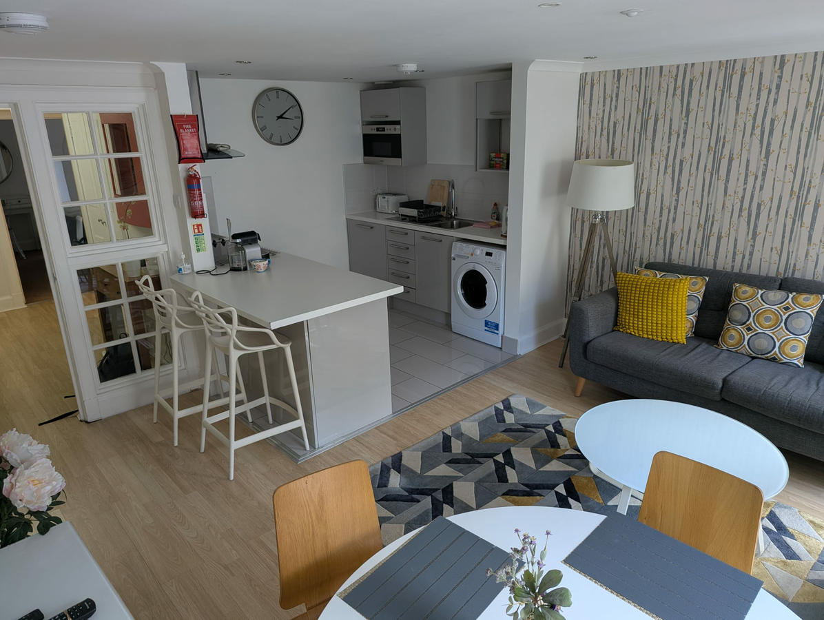 Beautiful second floor apartment decorated and furnished to very high standard whilst retaining attractive period features combined with modern luxury. Open plan living room/kitchen with double sofa-bed;