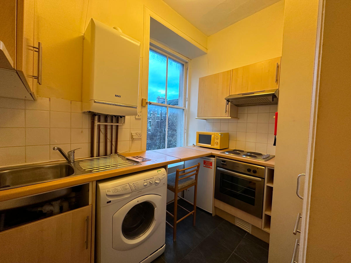 One bedroom flat with spectacular views over the city, located on the top floor of a traditional tenement building in Bruntsfield. Kitchen/dining/living room: