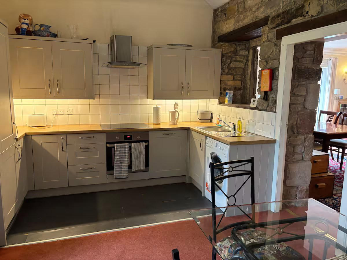 Fully fitted kitchen area with refrigerator, washing machine, dishwasher, electric kettle, Oven