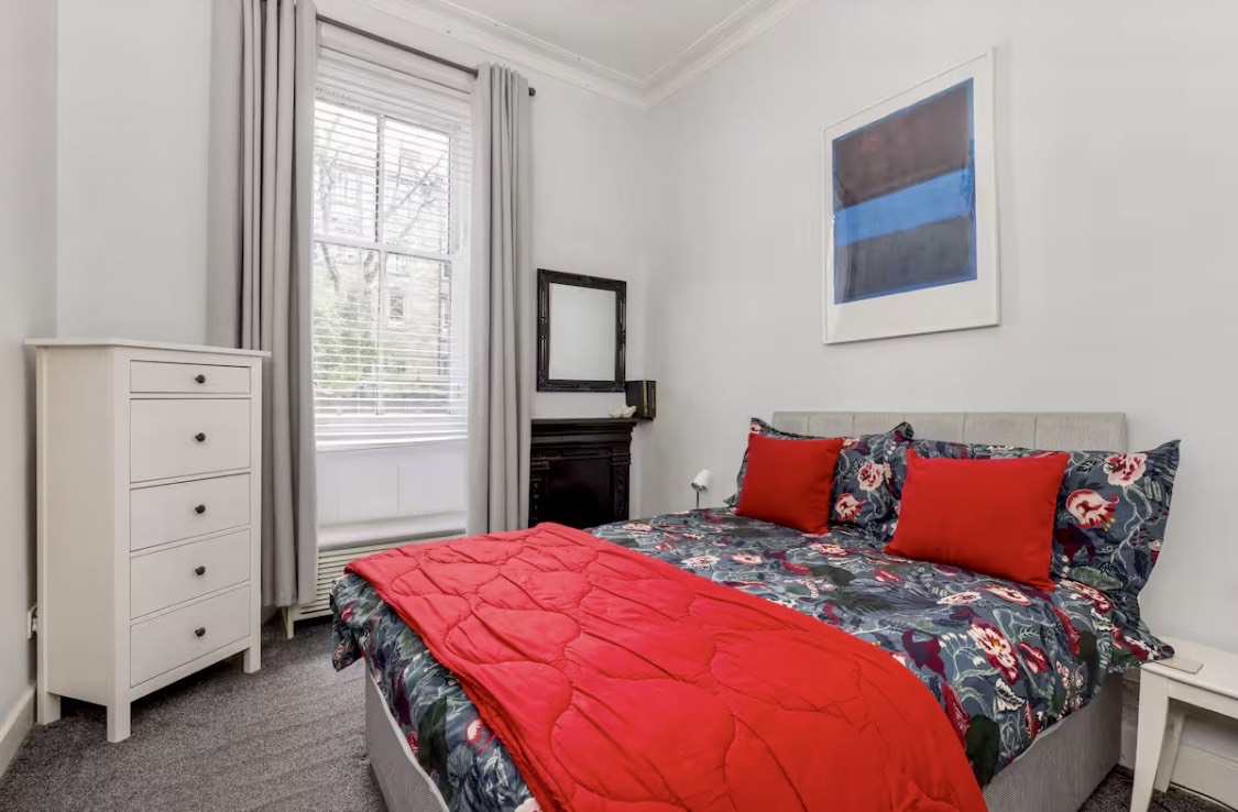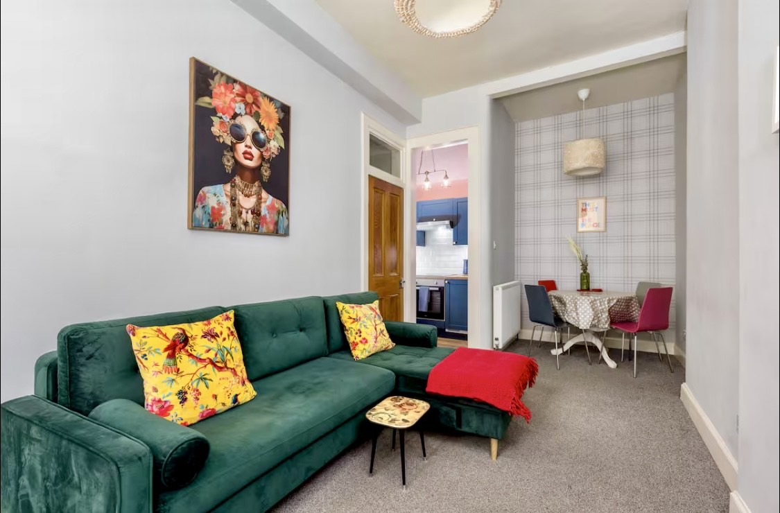 This centrally located one bedroom apartment is beautifully decorated with accents of Scottish charm throughout. Bright and airy open-plan lounge/kitchen/dining room, with the multiple large windows allowing you to look out into the old moss-covered brick buildings Edinburgh is famous for. The large L-shaped couch allows you to sit back and relax or cuddle up and read a book on a rainy day. The kitchen area is fully equipped with everything you will need to cook up a hearty meal on the days you just want to have a night in