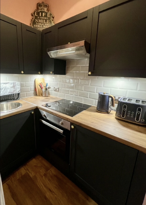 Fully equipped kitchen with oven/hob, microwave, toaster and kettle.
