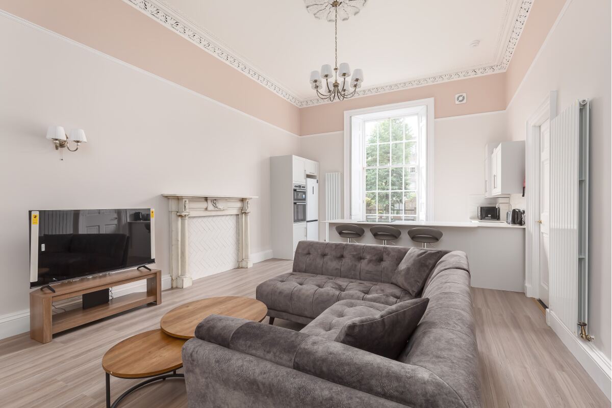 Centrally located opposite Princes Street Gardens, these stylish two bedroom apartments with views of Edinburgh Castle are the ideal base to explore the city. Each apartment is fully furnished and equipped to make your stay a home from home experience.Living area with comfortable seating and smart LCD TV
