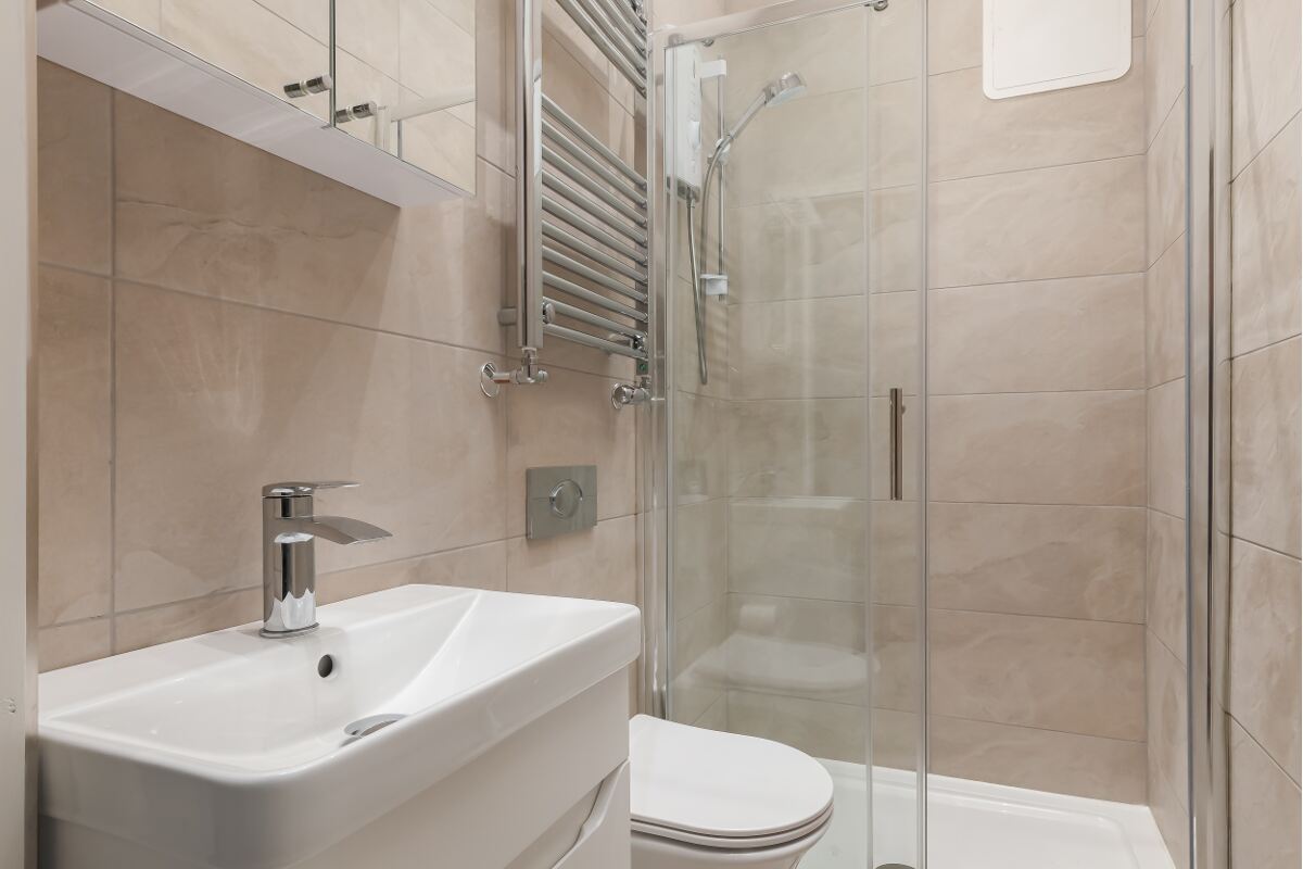 Luxury main bathroom (power shower over bath) with fine Italian ceramics.