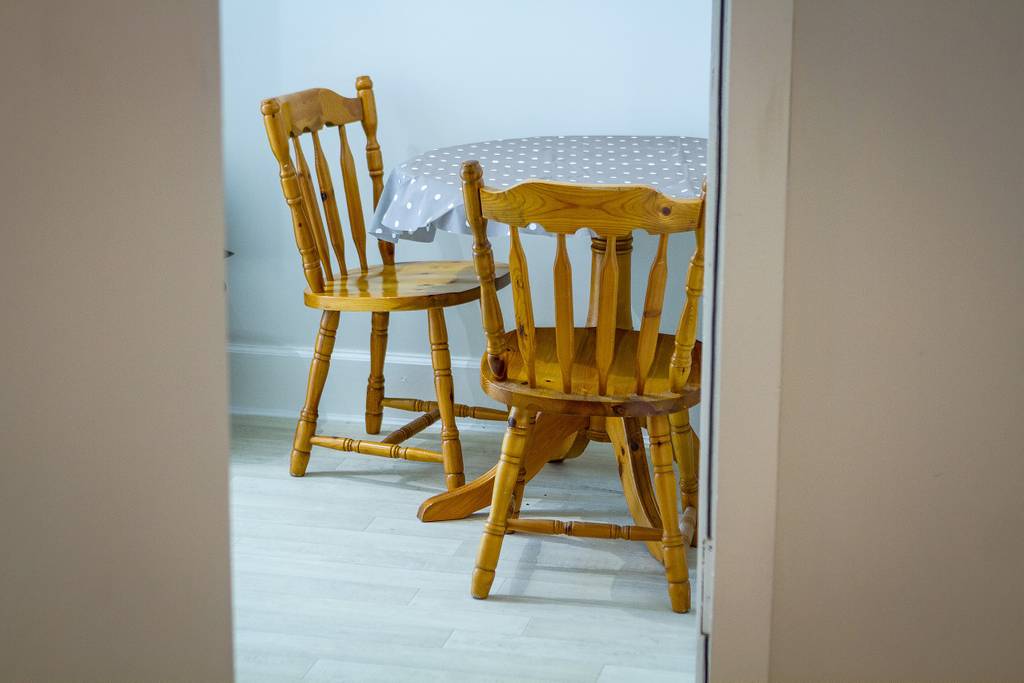 Fully equipped kitchen with oven/hob, fridge/freezer, microwave, washing machine, kettle, toaster, iron, ironing board and table and chairs.