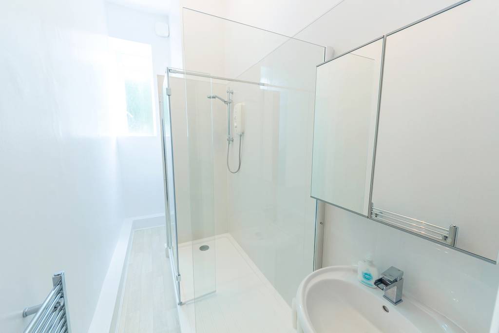 Fully modern bathroom with overhead shower.The apartment comprises a large double bedroom which has a king size bed ,and lounge has a sofa bed that can accommodate 1 adult or two children.