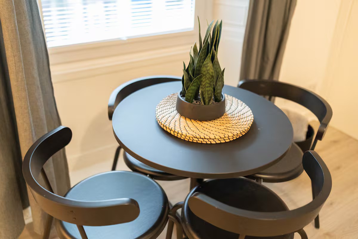 The dining area has a round glass table with 2 leather chairs and 2 folding chairs for extra guests.