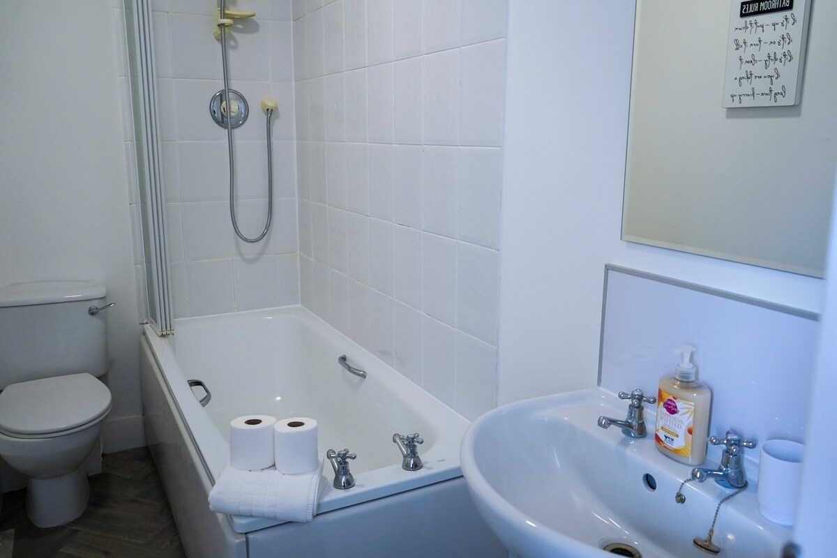 Bathroom with shower over bath.  Just minutes away from many Edinburgh Festival locations and is within walking distance to Princes Street.