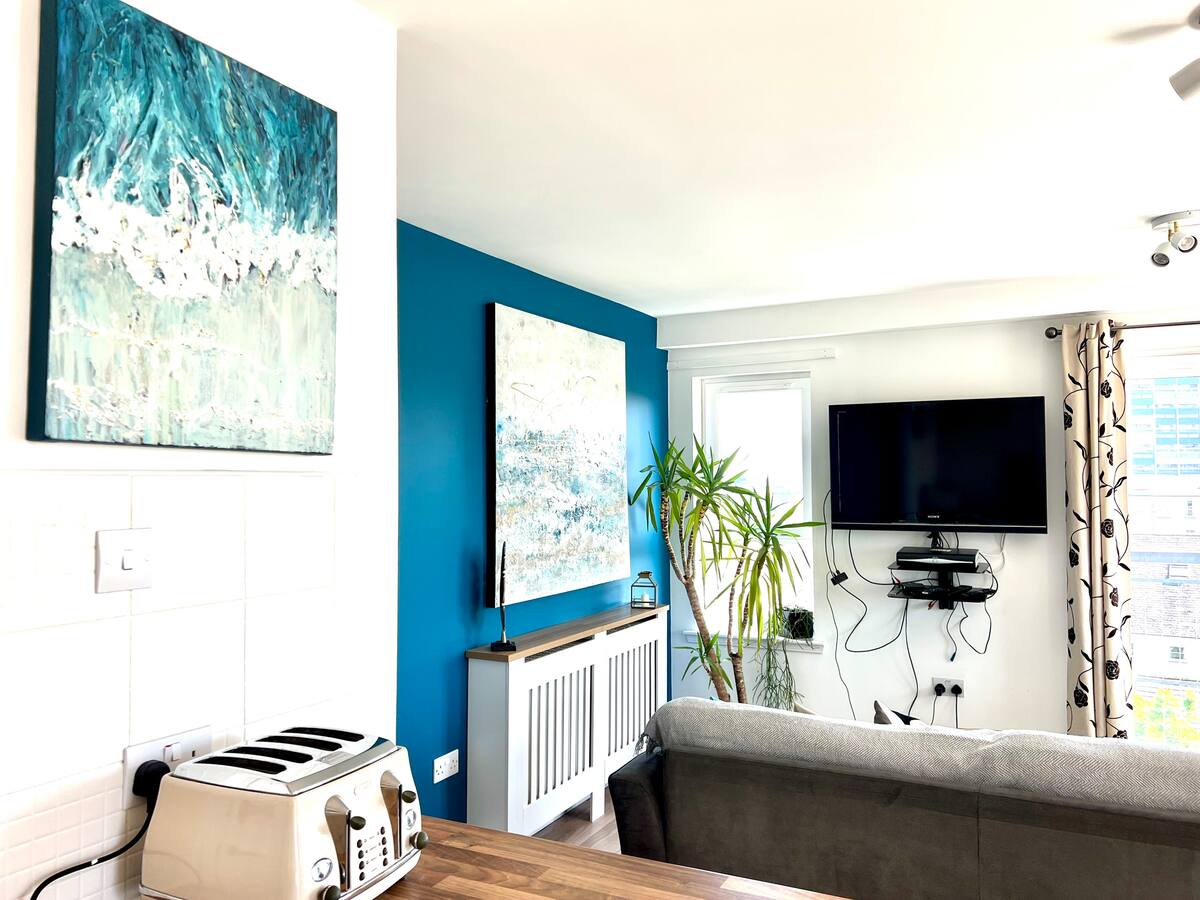Sunny large living room with views over The Meadows/Edinburgh Castle, TV and Wi-Fi internet, seating for 6;